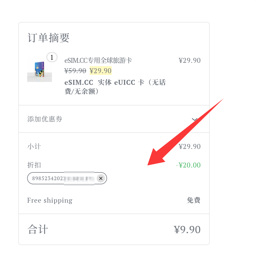 当你购买SIM.CC任意套餐,你可以以ICCID当做优惠券,购买物美价廉的eSIM.CC实体卡.